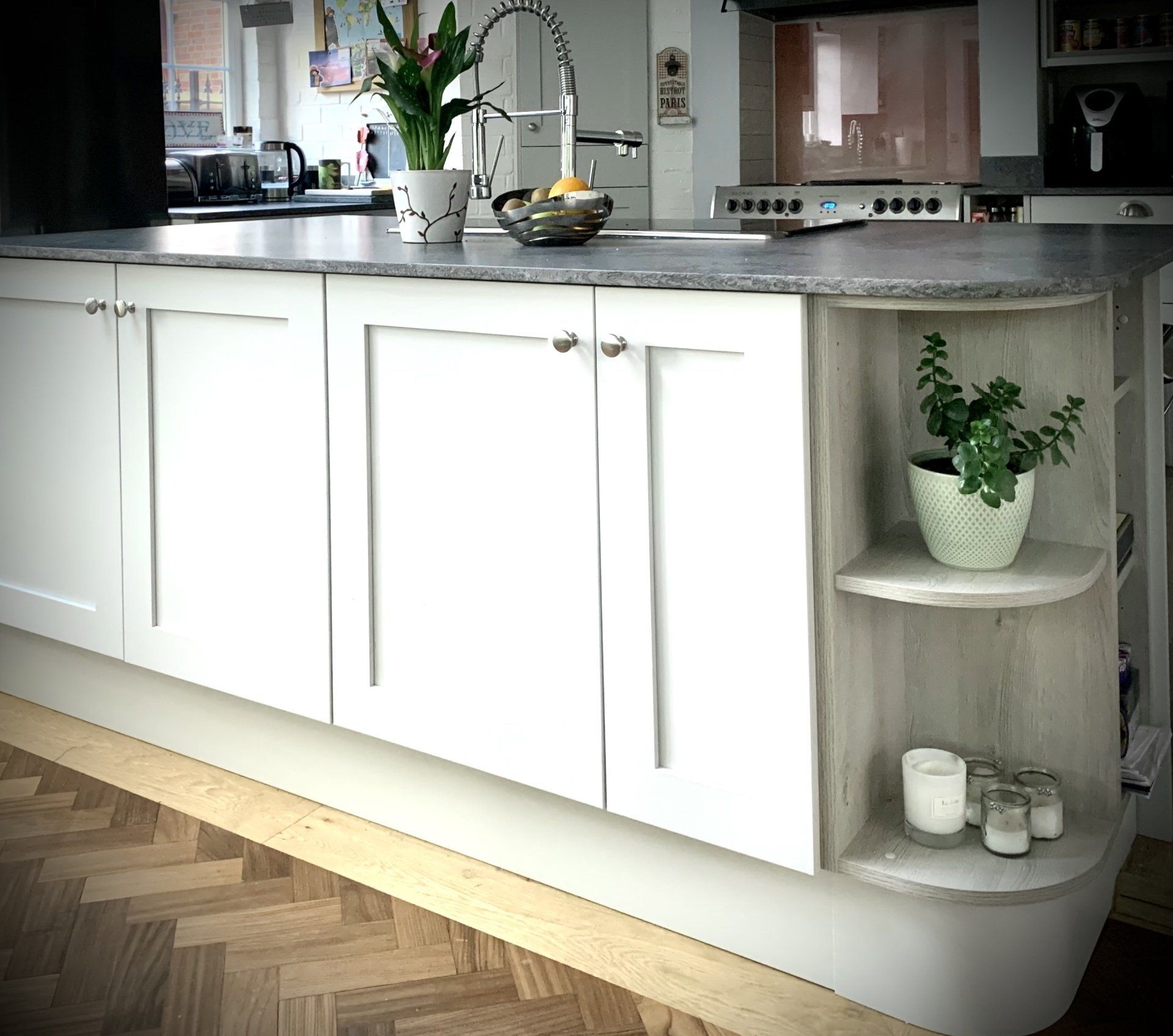 The entire length of the rear extension was glazed with floor-to-ceiling sliding doors to maximise the natural light and access to a decked area, which we decided to cover with glazing to allow better usage, even during rainy summer days. The kitchen space was build around a central island to optimise the traffic flow and ergonomics of the room, and toped with a "warm" quartz top, adding a modern touch to the entire design.